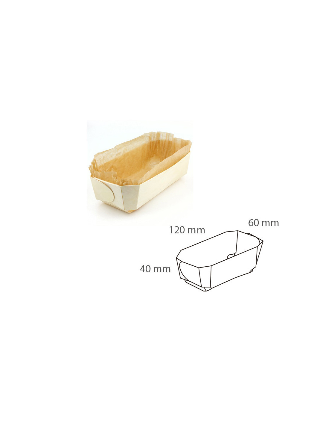 Molde de madera rectangular para hornear. Medidas: 120 x 60 x 40 mm. Pack de 50 unidades.