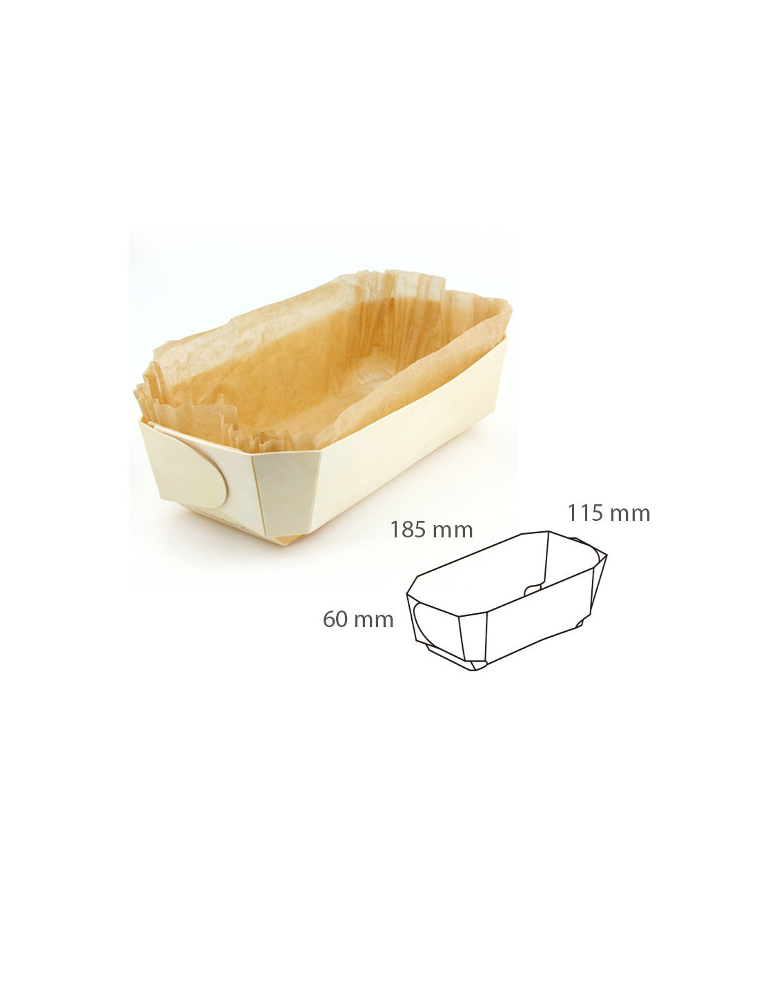 Molde de madera rectangular para hornear. Medidas: 185 x 115 x 60 mm. Pack de 50 unidades.