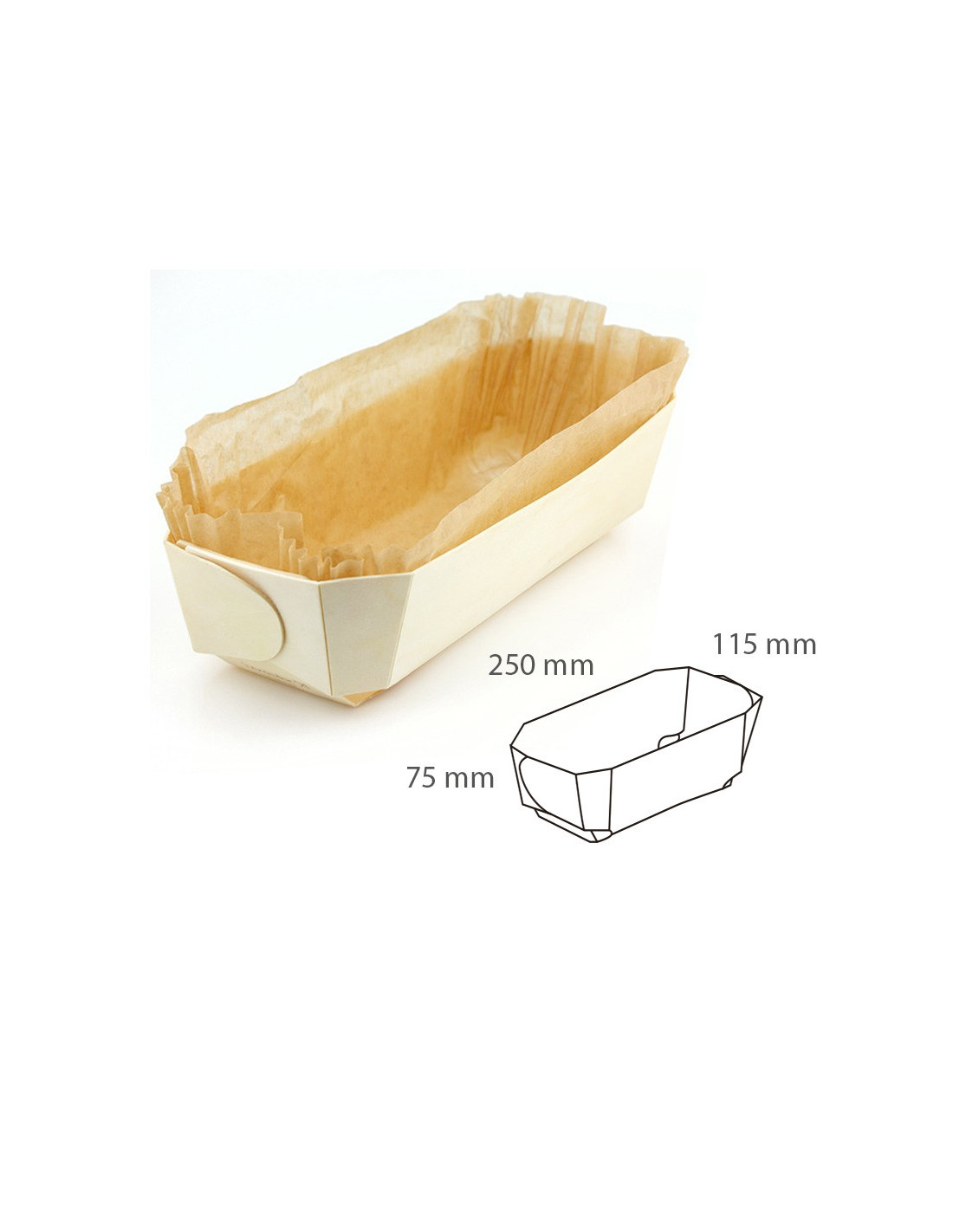 Molde de madera rectangular para hornear. Medidas: 250 x 115 x 75 mm. Pack de 50 unidades.