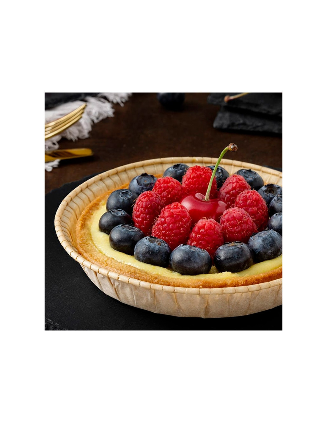 Molde redondo de papel para hornear Natur. Medidas: D90 mm x h 21 mm. Pack de 50 cajas con 50 unidades.