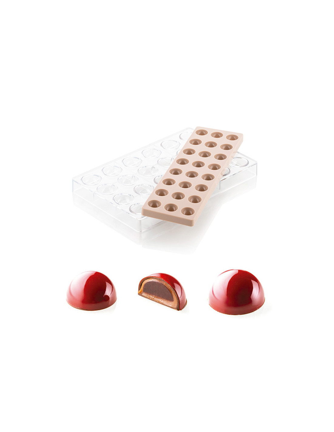 Kit Dome 01, compuesto por un molde de tritan y un molde de silicona. 24 cavidades. Cavidad: D26 x h22,5 mm.