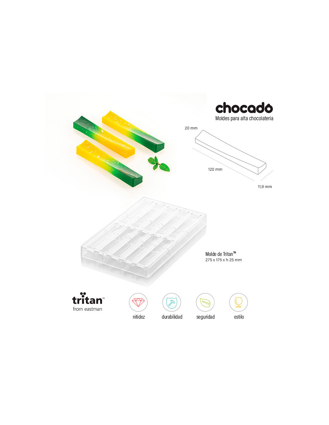 Molde de Tritan para tabletas snack, de Silikomart Professional. Medidas: 120 x 20 x h15 mm. 10 cavidades.