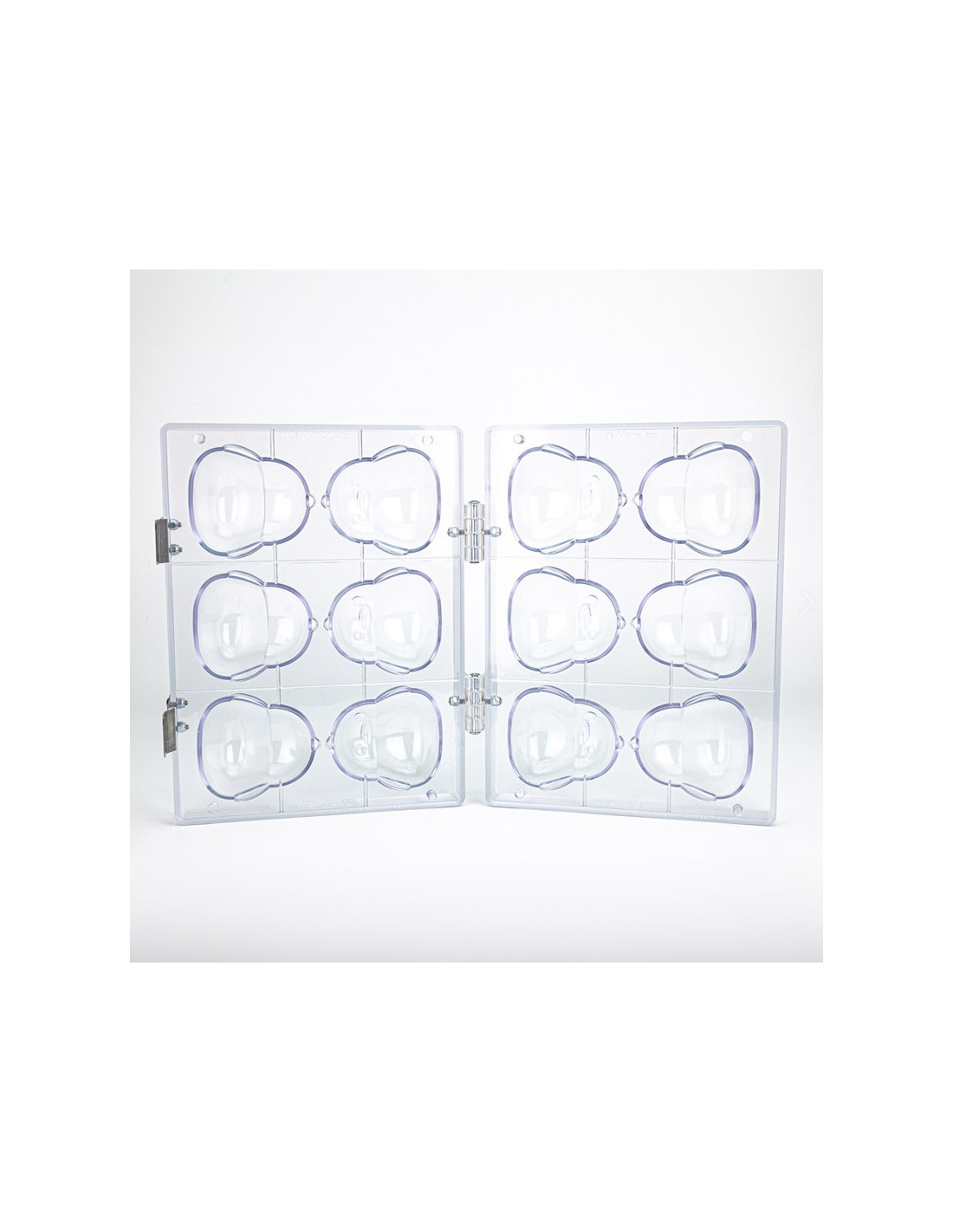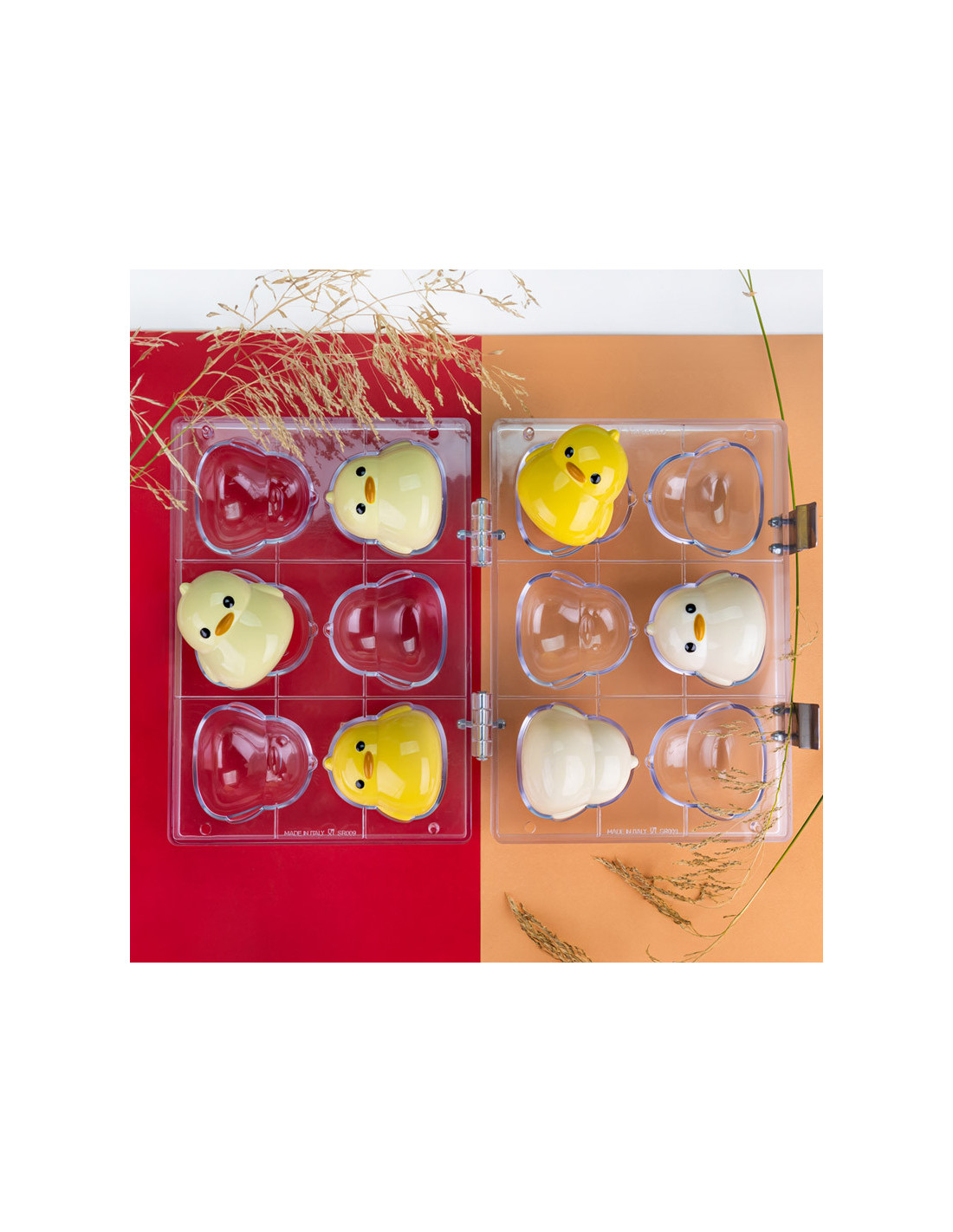 Molde doble de policarbonato para figura de chocolate Pollo Charlie, apto para producción industrial. Medidas: 73x73xh80 mm. 6 piezas. 70 gramos.