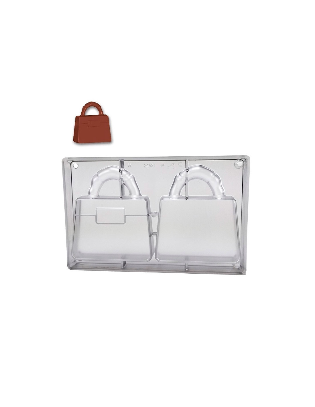 Molde 3D en forma de bolso de 140x122x56 mm. Formado por dos mitades, ideal para creaciones elegantes en chocolate o azúcar.