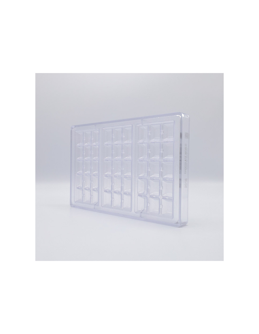 Molde de policarbonato MA2006 para snack de chocolate. Medidas: 50 x 26 x h3 mm. 16 cavidades.