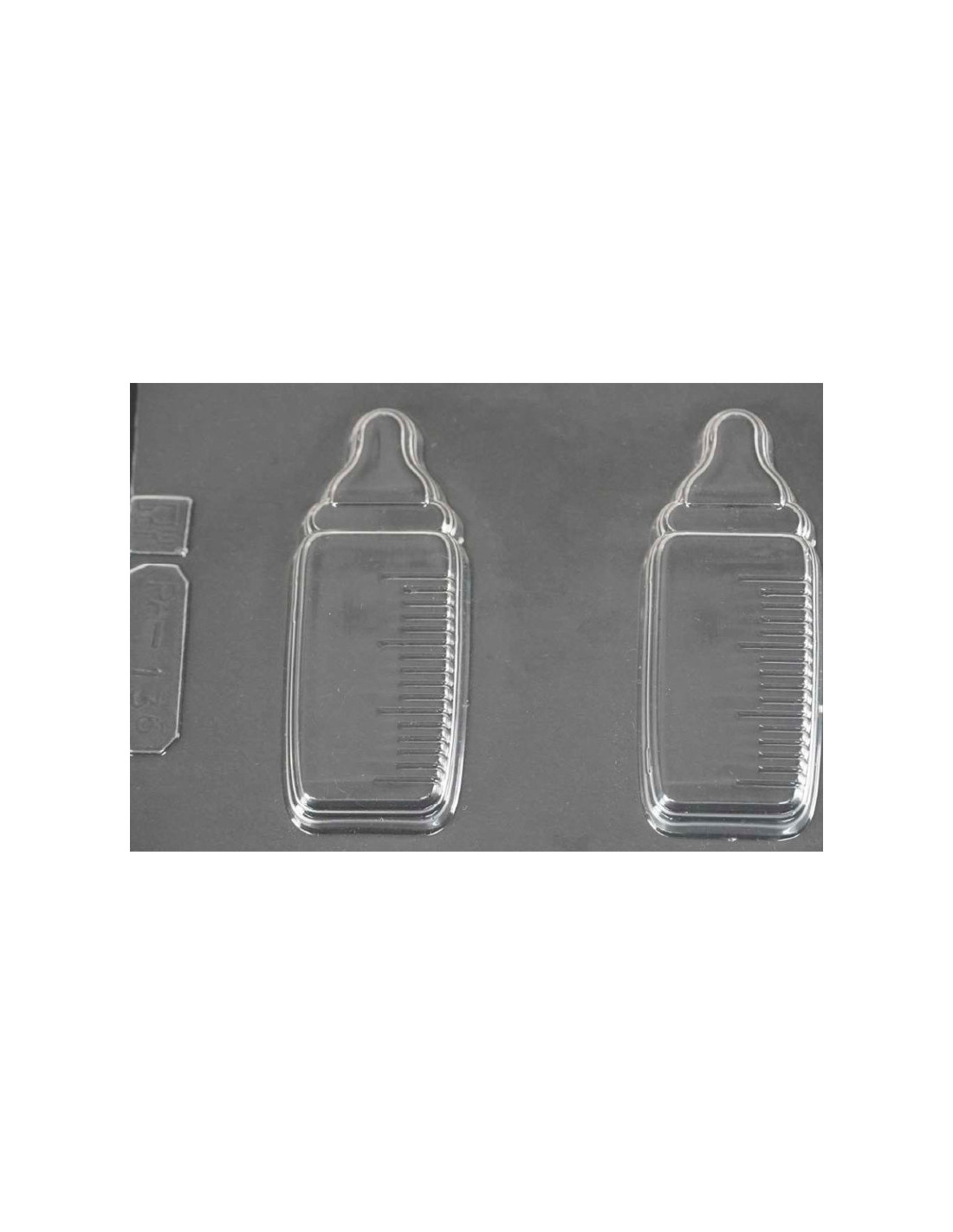Molde de PVC termoformado para pastillaje en chocolate ARPA136 Biberón. Medidas: 83 x 35 mm. 1 molde. 2 cavidades.