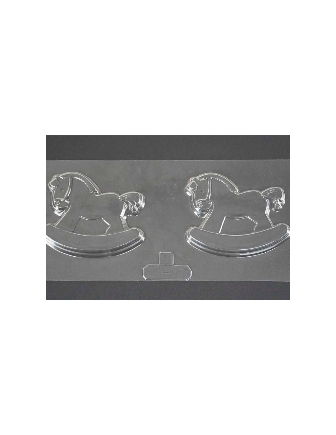 Molde de PVC termoformado ARPA137 para pastillaje en chocolate Caballo Balancín. 1 molde. 2 cavidades. Medidas: 80 x 72 mm.