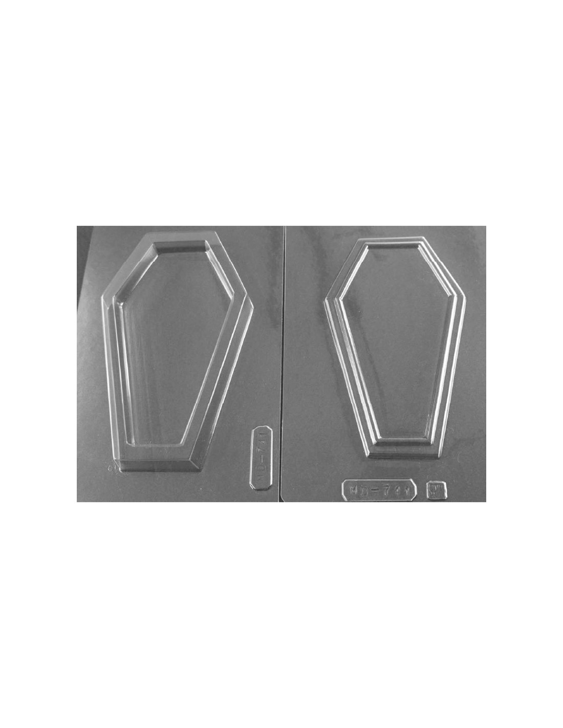 Molde de PVC termoformado ARMD741 para realizar la figura Ataúd. Dimensiones: 180 x110 x 27 mm. 2 cavidades. 1 molde. Producción: 1 figura.