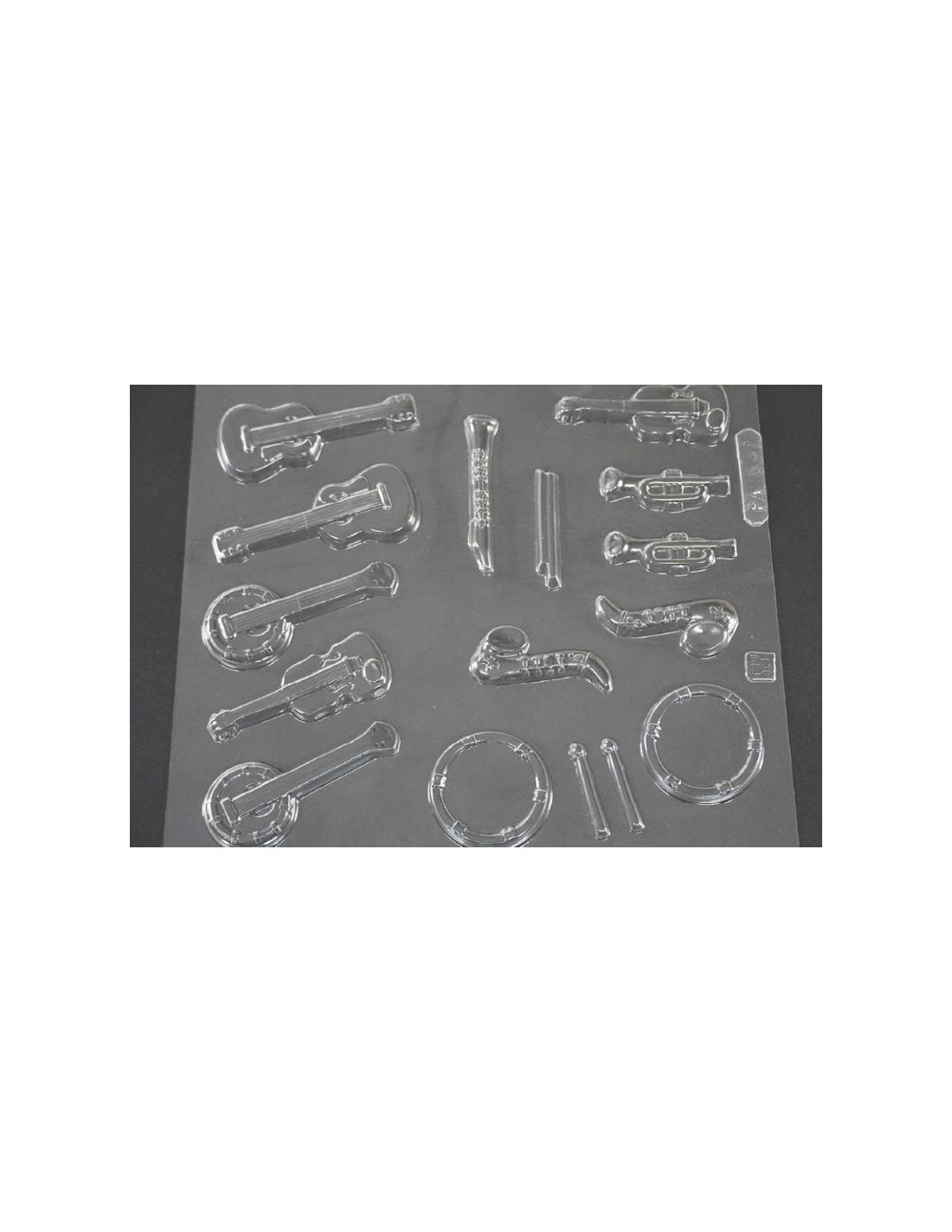 Molde de PVC termformado ARPA037 Instrumentos Musicales para decoración en chocolate. Medidas: 80 x 34 x 6 mm. 1 molde. 16 cavidades.