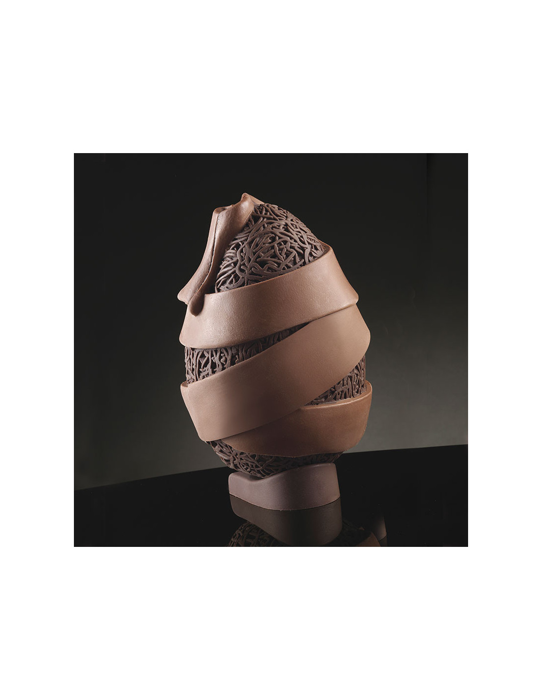 Molde profesional de silicona compuesto por 2 mitades que juntas crean un elegante huevo tridimensional con lazo decorativo integrado, ideal para chocolatería fina, pastelería creativa y vitrinas festivas.