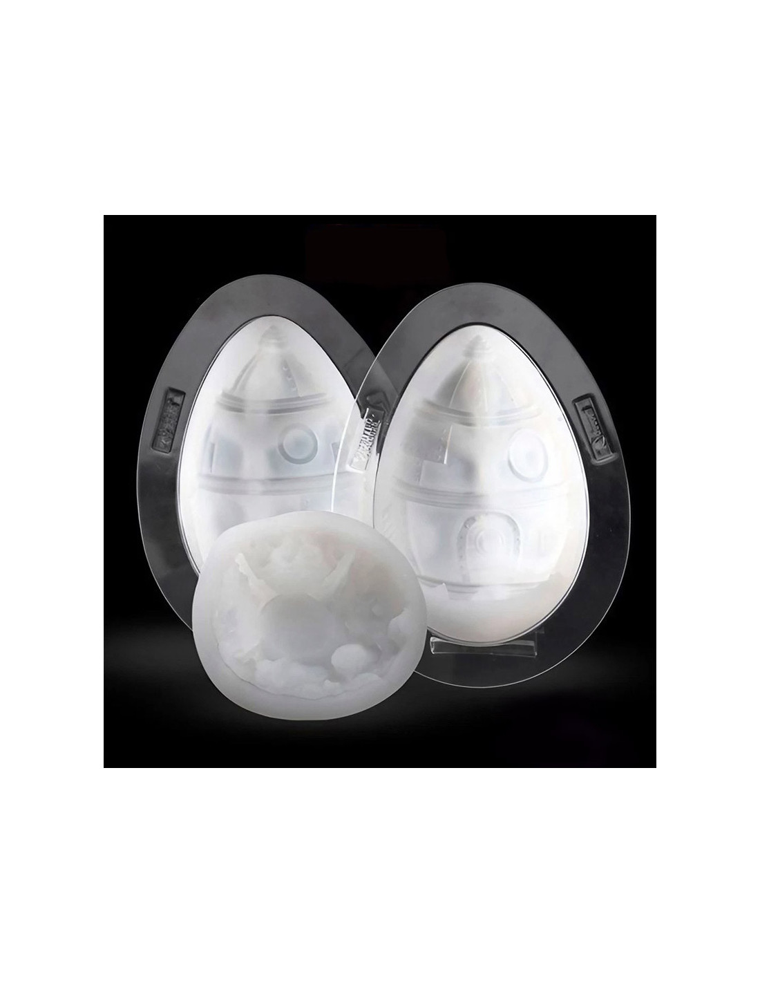 Molde de silicona alimentaria Huevo misil Decosil Guscio. 3 moldes (huevo + base). Medidas huevo: 125 x 110 x 175 mm. Medidas base: 125 x 55 mm. Volumen: 670 gramos. Producción: 1 huevo + base.