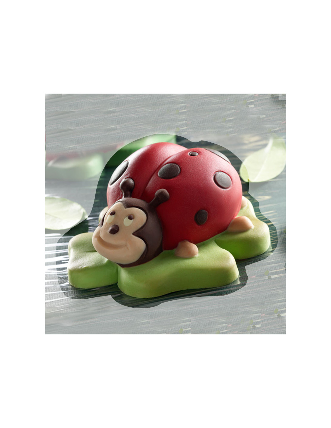 Molde de silicona alimentaria en una sola pieza con forma de mariquita tridimensional, ideal para crear decoraciones encantadoras y coloridas en pastelería artística. El diseño “Lorella” destaca por su estilo simpático y entrañable, con detalles bien definidos como las alas, la cabeza y las antenitas.