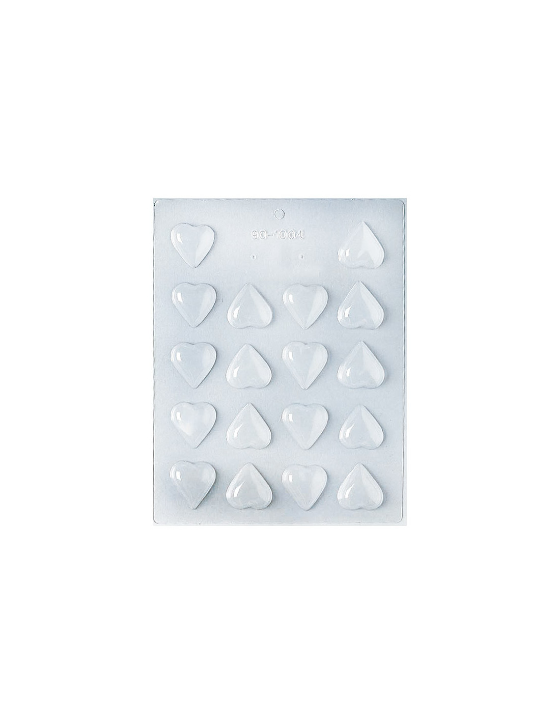Molde de PVC para realizar decoraciones de chocolate en forma de corazones planos. 14 cavidades de 30 mm x 27 mm x h 6 mm.
